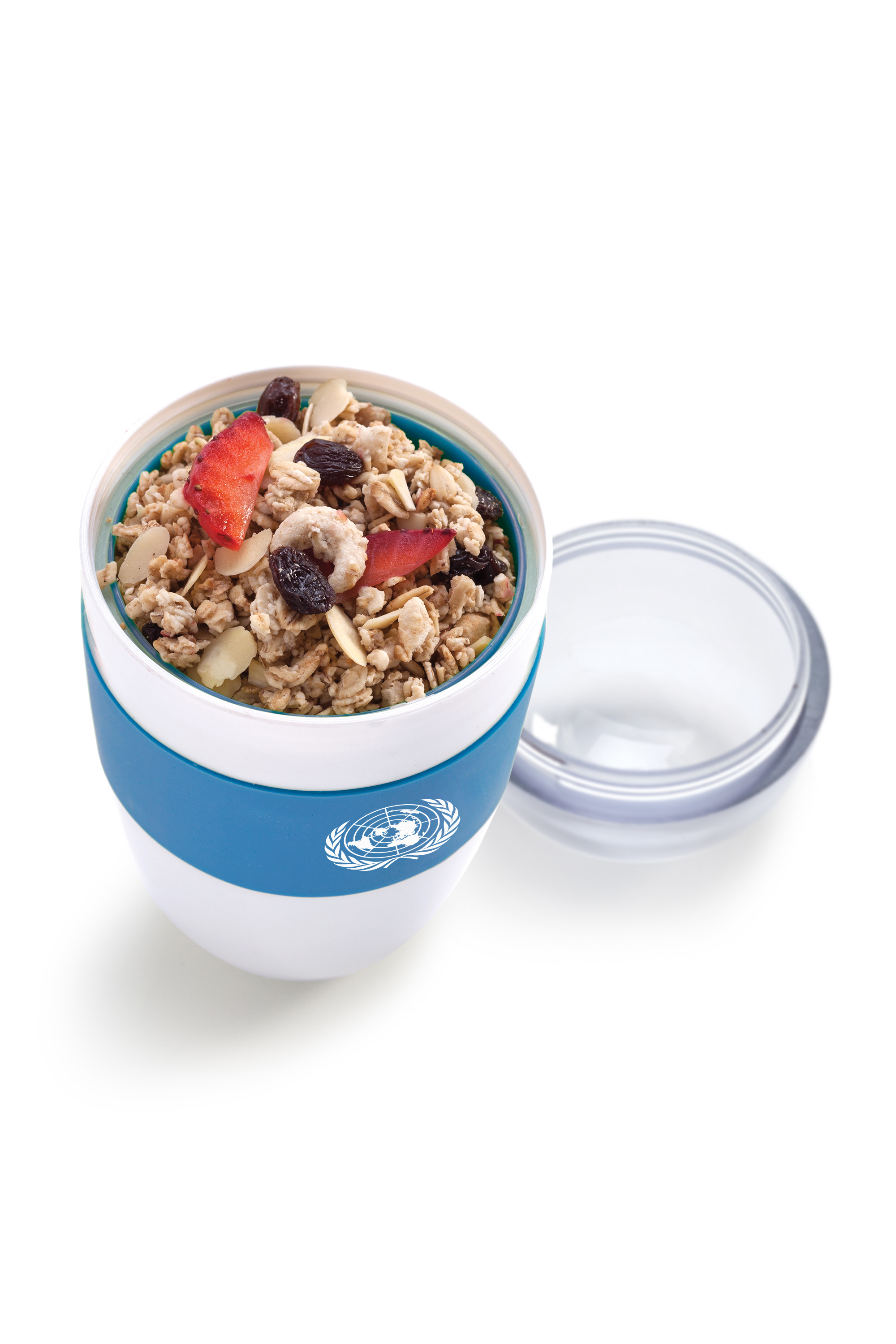 - Le récipient à double paroi garde le yogourt frais, tandis que la section supérieure contient vos extras.